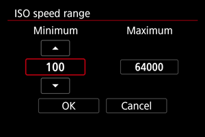 Изберете [ISO speed range/Диапазон за ISO чувствителност].