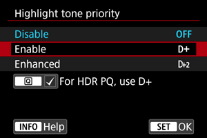 - [Enhanced/Усилено]: Намалява преекспонираните светли тонове дори повече от [Enable/Разрешено] при някои условия на снимане.