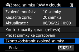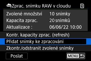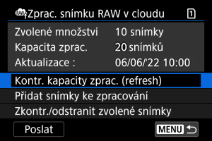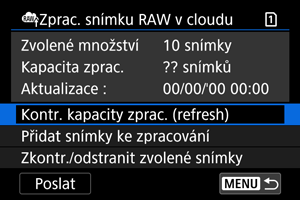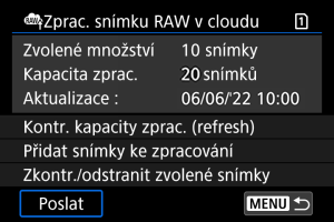 - Pokud nemáte placené předplatné pro zpracování snímku RAW v cloudu, hodnota položky [Kapacita zprac.] je [0]. Pokud provedete kontrolu kapacity pro zpracování a nemáte aktivní předplatné, na váš e-mail uvedený ve službě image.canon bude odeslána zpráva s informacemi o předplatném.