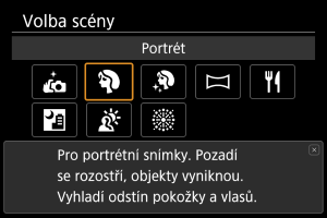 Režim [] (Portrét) použijte pro rozmazání pozadí a vyniknutí osoby, kterou snímáte. Zajišťuje také jemnější vzhled odstínů pokožky a vlasů.