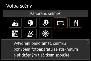 Pro snímání panoramatických obrázků použijte [] (Panoram. snímek). Panorama se vytvoří zkombinováním snímků zachycených během kontinuálního snímání, při kterém otáčíte videokameru jedním směrem s plně stisknutým tlačítkem spouště.