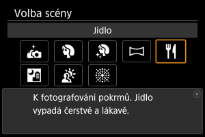 Režim [] (Jídlo) použijte pro pořizování kulinářských fotografií. Fotografie budou jasné a budou vzbuzovat chuť k jídlu. Na snímcích pořízených pod wolframovým světlem bude rovněž potlačen červený nádech daný zdrojem světla, atd.