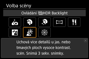 HDR Backlight) použijte pro scény s protisvětlem obsahující jasné i tmavé oblasti. Snímání v tomto režimu probíhá tak, že jsou pořízeny tři snímky s různými expozicemi. Tyto snímky jsou zkombinovány a z nich je vytvořen jeden snímek s HDR se zachováním detailů ve stínech, které by jinak byly ztracené.