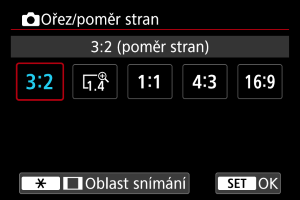 Před snímáním můžete změnit poměr stran. Pomocí možnosti [1,4x (ořez)] můžete fotografovat jako při použití teleobjektivu, protože tato možnost zvětší střed snímku.
