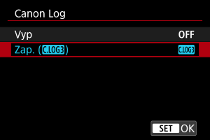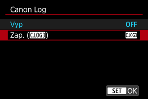 Aktivuje 10bitový záznam filmů Canon Log na kartu. Filmy lze také nahrávat na externí zařízení, která podporují 10bitový záznam.