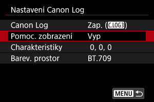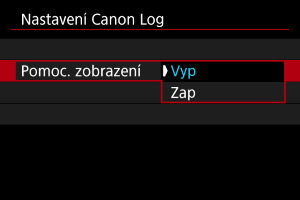 - Nastavení této funkce na hodnotu [Zap] neovlivňuje filmy nahrané na kartu nahrávané pomocí charakteristiky funkce Canon Log. A podobně má videovýstup HDMI charakteristiky křivky Canon Log a funkce Pomocník zobrazení se nepoužije.