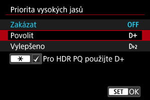 : Priorita vysokých jasů] je nastavena na [Povolit] a nelze ji změnit poté, co nastavíte [