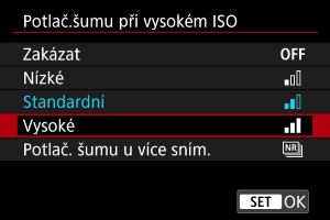 - Možnost [Potlač. šumu u více sním.] není dostupná, pokud je nastavena některá z těchto funkcí: AEB, bracketing WB, snímání snímků RAW nebo RAW+JPEG, potlačení šumu dlouhé expozice, režim HDR nebo nastavení HDR PQ, bracketing ostření a snímání s kreativními filtry.