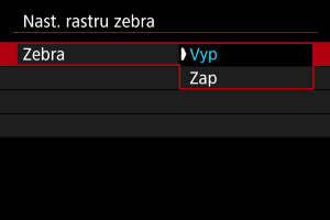 Chcete-li zjednodušit nastavení expozice před nebo během záznamu filmu, můžete zobrazit pruhovaný vzor přes nebo kolem oblastí snímku se zadaným jasem.