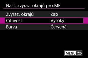 - Zvýraznění okrajů pro MF může být těžko rozlišitelné při vysokých citlivostech ISO, zvláště pokud je nastaveno rozšíření ISO. V případě potřeby snižte citlivost ISO nebo nastavte možnost [Zvýraz. okrajů] na [Vyp].