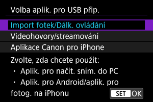 Po výběru možnosti [Videohovory/streamování] se pomocí propojovacího kabelu připojte k počítači a poté spusťte aplikaci.