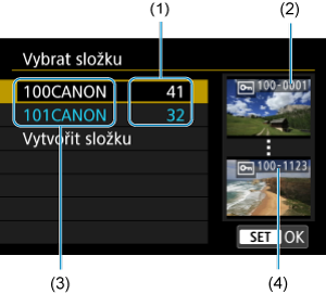 - Složka může obsahovat až 9999 snímků (čísla souborů 0001 až 9999). Po zaplnění složky se automaticky vytvoří nová složka s číslem složky zvýšeným o hodnotu jedna. Nová složka se automaticky vytvoří také v případě, že provedete ruční reset (). Lze vytvořit složky označené čísly v rozsahu 100 až 999.
