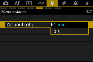 Stisknutím tlačítka v režimu snímání / režimu fotografování bezpečně zasunete objektiv přibližně po 1 min. Chcete-li objektiv zasunout okamžitě po stisknutí tlačítka , nastavte dobu zasunutí na [0 s].