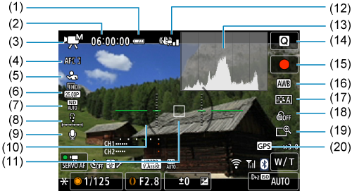 - (23) Indikátor úrovně záznamu zvuku (ruční)
