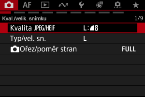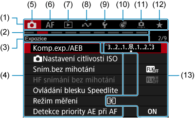 přepnete na další hlavní kartu (skupina funkcí). Karty můžete též přepínat stisknutím tlačítka