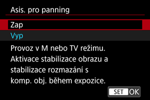 Pokud je v režimu panning nasazený kompatibilní objektiv, chvění fotoaparátu a rozmazání objektu lze korigovat. Platí pro režim [M] nebo [Tv].
