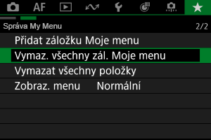 Můžete odstranit všechny záložky nabídky Moje menu. Po výběru položky [Vymaz. všechny zál. Moje menu] se odstraní všechny záložky [MY MENU1] až [MY MENU5] a obnoví se výchozí stav záložky [].