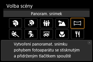 Při snímání panoramat použijte [] (Panoram. snímek). Panorama se vytvoří zkombinováním snímků zachycených během kontinuálního snímání, při kterém otáčíte fotoaparátem jedním směrem s plně stisknutým tlačítkem spouště.