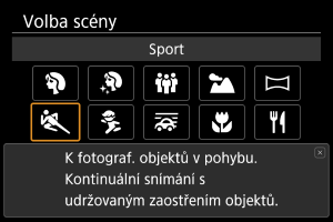 [] (Sport) použijte pro snímání objektů v pohybu, jako jsou běžící osoby nebo pohybující se vozidla.