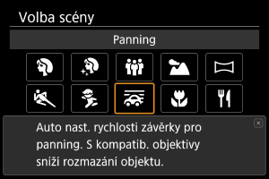- Rychlosti závěrky jsou spíše pomalejší. Z tohoto důvodu je režim Panning obecně nevhodný s výjimkou panoramatického snímání.