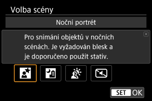 [] (Noční portrét) použijte pro pořízení jasných a nádherných fotografií lidí s nočními scénami na pozadí. Vezměte na vědomí, že fotografování v tomto režimu vyžaduje externí zábleskovou jednotku. Doporučujeme použít stativ.