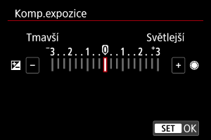 Kompenzaci expozice můžete nastavit směrem ke kladné nebo záporné straně, aby se snímky zjasnily nebo ztmavily v poměru ke standardní expozici určené fotoaparátem.