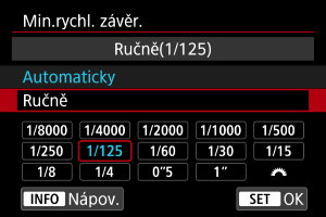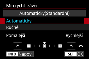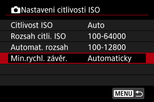 Minimální rychlost závěrky lze nastavit tak, aby automaticky nastavená rychlost závěrky nebyla při automatickém nastavení citlivosti ISO příliš nízká.