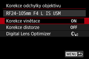 • Při použití objektivu od jiného výrobce než společnosti Canon doporučujeme pro korekce nastavit možnost [Zakázat], přestože se zobrazí zpráva [Data korekce dostupná].