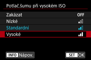 Můžete omezit vznikající šum na snímku. Tato funkce je zejména efektivní při fotografování při vysokých citlivostech ISO. Při pořizování snímku při nízkých citlivostech ISO lze dále potlačit šum v tmavších částech snímku (v oblastech stínů).