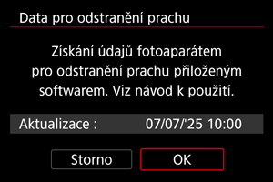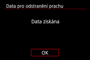 Od tohoto okamžiku bude fotoaparát doplňovat získaná data pro odstranění prachu ke všem fotografiím. Data pro odstranění prachu se doporučuje získat před fotografováním.