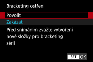 - Bracketing ostření není k dispozici, pokud je fotoaparát nastaven na ruční zaostřování ().