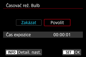 Všimněte si, že časovač režimu Bulb lze nastavit a projeví se pouze v režimu B (žárovková expozice).
