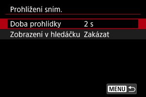 - Nastavení [Zobrazení v hledáčku] se projeví při nastavení položky [Prohlížení sním.] na jinou možnost než [Vyp].