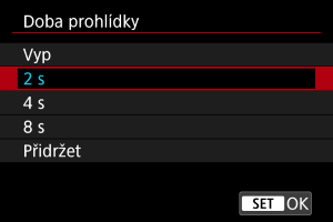 Chcete-li zachovat snímek zobrazený okamžitě po snímání, nastavte možnost [Přidržet] a pokud si nepřejete snímek zobrazit, nastavte možnost [Vyp].