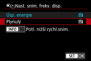 Můžete nastavit snímkovou frekvenci displeje pro obrazovku záznamu při fotografování. Zvolte, zda chcete šetřit baterii, nebo použít pro zobrazení vysokou snímkovou frekvenci.