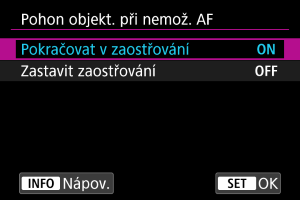 - Možnost [Zastavit zaostřování] je doporučena pro superteleobjektivy nebo jiné objektivy, které pokrývají velkou oblast, aby se zabránilo významnému zpoždění z řízení vyhledávání zaostření, pokud se objektiv hodně rozostří.