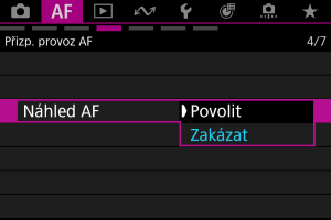 Zakazuje spuštění pomocného světla AF. Nastavte, pokud nechcete, aby zablesklo pomocné světlo AF.