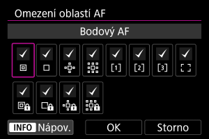 Dostupné oblasti AF můžete omezit pouze na ty, které běžně používáte. Vyberte dostupné oblasti AF a stisknutím tlačítka přidejte zatržítko [