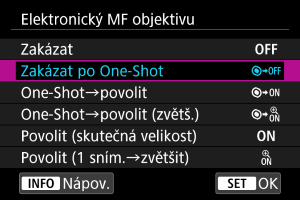 : Elektronický MF objektivu] nastavena na jinou možnost než [Zakázat]. Upozorňujeme, že tato funkce působí, jen když je možnost [Namáčknutí] v části [