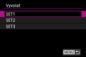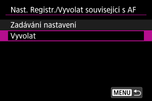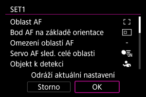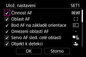- Uloží se všechny vybraná nastavení AF. Chcete-li nastavení smazat nebo znovu vybrat, otočením ovladače