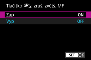 Když tuto funkci nastavíte na [Zap], můžete zrušit zvětšené zobrazení namáčknutím tlačítka spouště při fotografování v režim ostření MF.