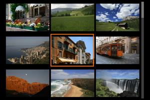 otočíte ještě dále proti směru hodinových ručiček, zobrazí se náhledový index 9, 36 nebo 100 snímků. Pokud ovladač otočíte po směru hodinových ručiček, vrátíte se přes zobrazení 100, 36, 9 nebo 4 snímků na zobrazení jednotlivých snímků.