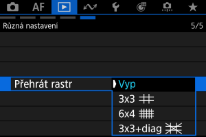 Pokud je možnost [Přehrát rastr] nastavena na jinou možnost než [Vyp], při zobrazení panoramatických snímků se zobrazuje také jedna svislá a jedna vodorovná čára.