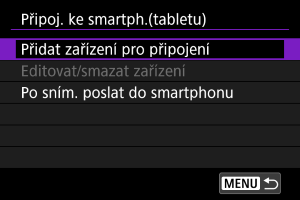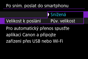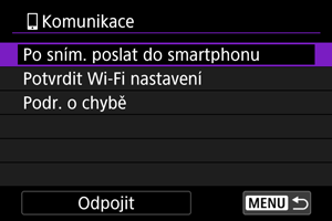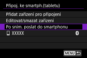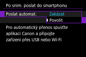 Snímky lze odesílat do smartphonu automaticky. Před provedením následujících kroků se ujistěte, že připojení Wi-Fi fotoaparátu a smartphonu je ukončené.