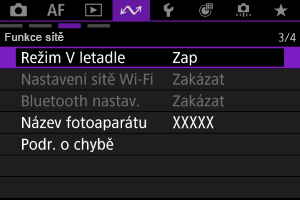 Pokud dáváte přednost tomu, abyste při vypnutém fotoaparátu nezůstávali připojeni prostřednictvím funkce Wi-Fi nebo Bluetooth, když je systém vypnutý, nastavte [: Režim V letadle] na [Zap] nebo [