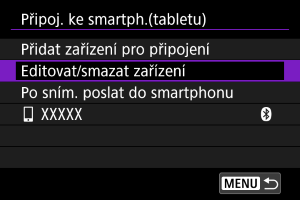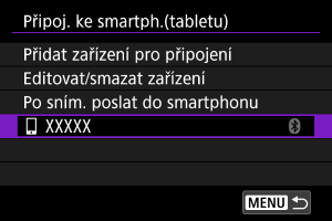 - Fotoaparát nelze připojit ke dvěma nebo více zařízením současně pomocí Bluetooth. Přechod na jiný smartphone pro připojení Bluetooth je popsán v části Opětovné připojení pomocí sítě Wi-Fi/Bluetooth.