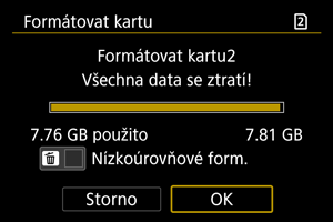 - Probíhající nízkoúrovňové formátování paměťové karty můžete zrušit výběrem možnosti [Storno]. I v tomto případě už bude dokončeno normální formátování a kartu bude možné používat obvyklým způsobem.