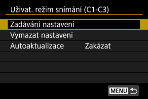 Pokud změníte nastavení při fotografování v uživatelském režimu snímání, režim se může automaticky aktualizovat na nové nastavení (Automatická aktualizace). Chcete-li tuto automatickou aktualizaci povolit, nastavte v kroku 2 položku [Autoaktualizace] na [Povolit].
