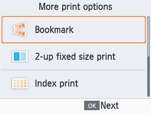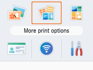 Nabídka [More print options/More print options/Další možnosti tisku] na obrazovce Domů umožňuje tisknout index, opakovat tisk a využívat další možnosti týkající se snímků na paměťových kartách nebo jednotkách USB flash.