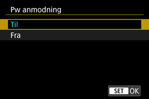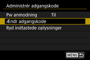 Brug disse indstillinger til at administrere den adgangskode, der indtastes, når afbryderen sættes til , eller kameraet fortsætter betjening fra autosluk. Se Indstilling af adgangskode for at få instruktioner om indstilling af den adgangskode, der kræves ved opstart af kameraet.